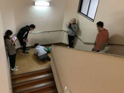 第3回緊急時対応シミュレーションを実施しました。今回は子どもが階段から転落し、心肺停止に至ったことを想定した、階段の踊り場での訓練でした。教職員は声を掛け合いながら心肺蘇生法をし、救急車を要請する設定で行いました。事後研修会では、実際に緊急事態が起こった場合を考えながら、積極的に感想や意見、質問を出し合いました。今回、学んだことを今後に活かしていきます。