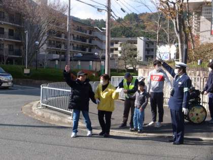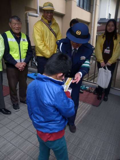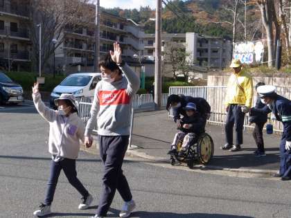 学校で交通安全の学習をした後、校外に出て実際に活動しました。子どもたちは学んだ交通ルールを守って、落ち着いて取り組むことができました。