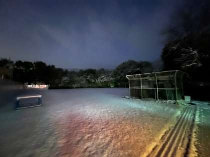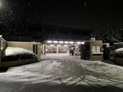 おはようございます。午前6時30分現在,学校周辺の積雪は2cmです。路面は凍結し,雪は降り続いています。