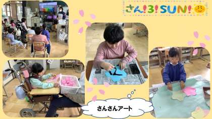 「さんさんアート」(造形活動)では、西総合支援学校を卒業されるお兄さん・お姉さんに「おめでとうございます。」「これからも頑張ってください。」の気持ちを込めて、花飾りを作りました。花びらの形に切ったり、花紙を貼ったり、文字を書いたりして作りました。「できたよ。」「花びらやな。」「〇〇を頑張った。」などと振り返り、素敵な飾りができました。
