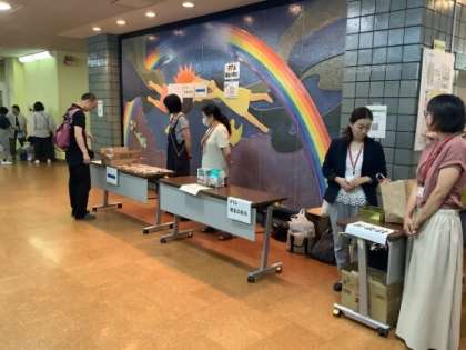 本日授業参観日でした。たくさんの保護者の方に見守られながらも子どもたちは落ち着いていて、普段通りの様子を見ていただくことができました。玄関前では今月担当の中学部の子どもたちによるワークスタディの製品販売をおこないました。「いらっしゃいませ」と大きな声を出し商品を手渡すなど接客を楽しむ様子も見られました。そのほかPTAによる備蓄品の販売や修学旅行の説明会などもおこなわれました。