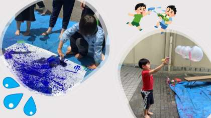 アクションペインティングに取り組みました。造形大好き!元気いっぱい!な2年生にぴったりの活動で、全身で造形活動を楽しみました。霧吹きや水鉄砲に絵の具を入れて、大きな紙や的に向かって吹きかけました。絵の具が飛び散る様子を見て、大喜びの様子。2年生らしいダイナミックな作品が出来上がりました。
