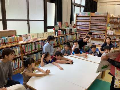 次に本の読み聞かせ。写真カードから本を読む先生を選び、お願いしに行きました。読み聞かせでは、指導者の先生の本の読み聞かせに耳を傾けたり、言葉を聞いて一緒に声を出して読んだりしました。