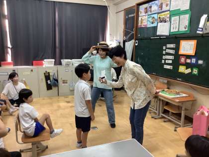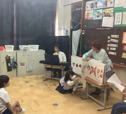 今日はひなたぼっこの会の方々が来て小学部2年生向けに読み聞かせをしてくださいました。子どもたちはみんな真剣な表情で物語に合わせて進んでいく大型絵本を見ていました。読み聞かせに合わせて入るキーボードの曲や用意してくださった小道具の演出も加わり、いつも先生に読んでもらっている絵本とはまた違う絵本の楽しみ方ができていました。