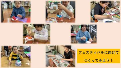 6年生は「ジャンプアップパーティをしよう!」をテーマにフェスティバルに向けて取り組んでいます。舞台発表で使用する小道具や展示する作品を作成しています。「どんな形にしようかな?」「もっとたくさん飾り付けよう。」など,1人ひとり自分の好きな色や素材を選んでのびのびと作品を作っています。ぜひフェスティバルで作品を見てください。