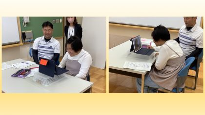 この取組はタブレットを使って遠隔地のロボットカフェにいるOriHime(分身ロボット)を遠隔操作し、カフェの店員として就労体験をするプログラムです。本校高等部生徒はこれまでの研修、体験を経て、今日は名古屋のロボットカフェに来られたお客さまに接客をする体験をしました。生徒は注文内容を丁寧にたずねた後、「どこから来ましたか?」「私は京都にいます!」など、楽しくおしゃべりも交わしながら接客できました。お客さまは「楽しかったです。ありがとう!」と最後に言ってくださいました。生徒はお客さまとタブレット越しにお別れをした後、「少し寂しいです」と別れを惜しんでいました。