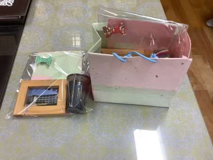 各班の製品を詰め合わせて、袋も新校舎から見える西山の新緑と桜をイメージして染め上げました。