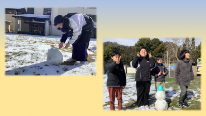 先週の雪の日、5年生の子どもたちは雪だるまを作ったり、足跡をたくさんつけて遊んだりしました。手が冷たくなるとお湯を入れたペットボトルで温まっていました!