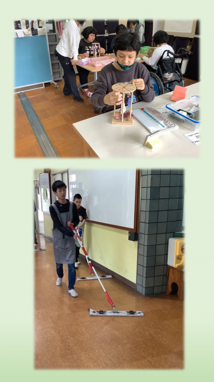 ワークスタディの授業より。1年生も体験を経て、真剣な眼差しで指導者の話を聞いたり、先輩たちにならって作業をしたり、落ち着いた雰囲気で学習に取り組んでいます。