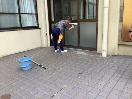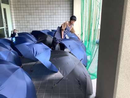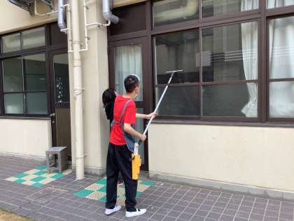 高等部ワークスタディ「メンテナンス班」の活動より。昨日は雨降りだったので、スクールバスや放課後デイサービスの車を利用する時にみんなが使う濡れた傘を干してくれていました。また、小中庭の窓をさまざまな清掃道具を使って外側からもピカピカに磨いてくれました。「メンテナンス班」のさまざまな取組によって気持ちのいい学校になっています。