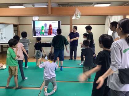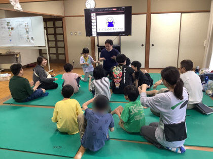 朝食を終えて「朝の会」をしました。朝のあいさつの後、ひとりひとりの名前を呼びながらの健康観察。みんな元気にこたえていました。今日のスケジュールを確認して、ラジオ体操で身体を動かしました。