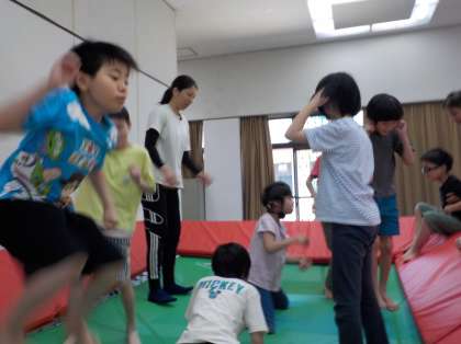 生活学習室で予定を確認した後は公園に行く予定でしたが、外がとても暑かったので、ホールでトランポリンをしました。公園に行けないのは残念でしたが、大きなトランポリンで身体を大きく動かしたり、揺れを感じたりして、楽しく過ごすことができました
