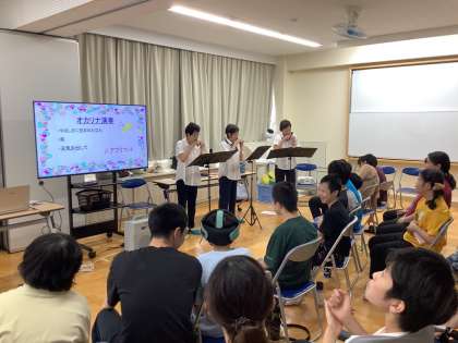 今日は地域で活動されている「木もれ日(朗読サークル)」と「アプリコット(オカリナ演奏グループ)」の方々にお越しいただきました。読み聞かせやオカリナ演奏が始まると、生徒たちは真剣にお話を聞いたり、演奏に合わせてリズムを取ったりしていました。とても楽しい時間を過ごすことができました。木もれ日さん、アプリコットさん、ありがとうございました。