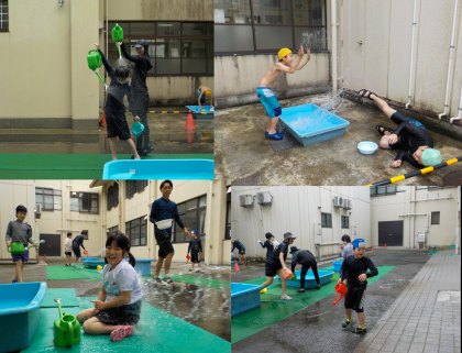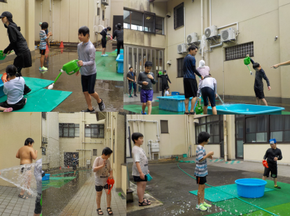 6月25日の午後から「水に親しもう」の学習をしました。午後からは太陽も出て絶好の水遊び日和となりました。バケツやじょうろに水を入れて自分の体にかけたり、指導者と水をかけ合ったりして、笑顔いっぱいの時間になりました。