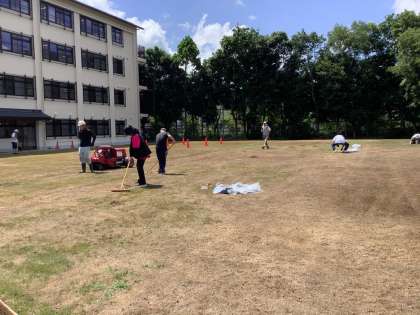 グラウンドのインターシーディング(夏芝の種まき)を行いました。NPO法人「芝生スクール京都」の皆さんに来校していただき作業をしました。コアリング(芝生に細かい穴をあける作業)のあと、種まき、土入れが行われました。夏季休業中に養生し、再び青々とした芝生が育つのが楽しみです。