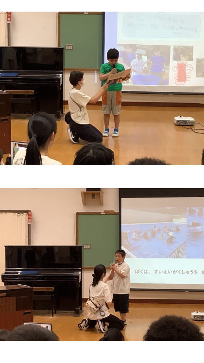 4月から今日までで「がんばったこと」「楽しかったこと」を各学部の代表が発表しました。「科学センター学習が楽しかったです」「水泳学習をがんばりました」「スポーツをして身体を鍛えました」など、写真とともに発表した児童生徒、「ピアノを弾くことをがんばりました」と実際にみんなが聞き覚えのあるメロディーを弾いて聞かせてくれた生徒もいました。