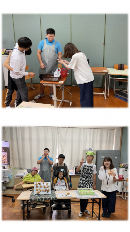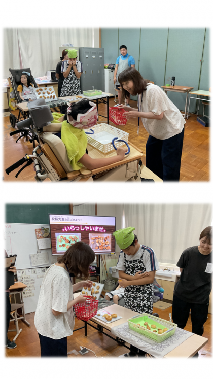 高等部1年学年ユニットでは、校長先生をお招きしました。受付ではかごと「飾りパン引換券」が渡されました。数々のかわいい「飾りパン」の中から校長先生は、ベーグルとウサギを模したものを選んでかごに入れ、引換券を渡して、かわいい作品を手にされました。