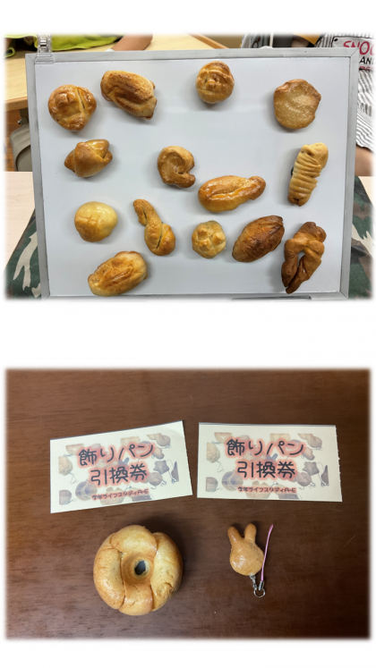 「飾りパン」は小麦粉を使い、本当のパン作りのように、形作り、焼上げ、キーホルダーやマグネットに仕上げていました。こんがり焼き色がついて、さまざまな種類のパンを形どったとても楽しい作品ばかりでした。ほんのり、パンのいい香りがします。