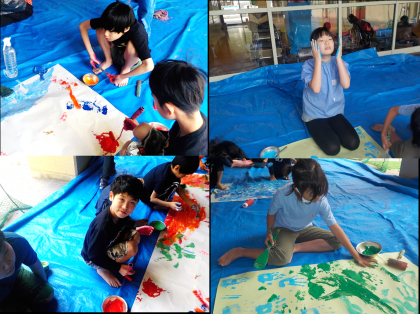 初めは筆やはけを使って色を塗っていましたが、一人の児童が手に絵の具をつけだすと、それを見た他の児童も自分もやってみようと、手や足など全身に絵の具をつけ、全身を使って模造紙に色を塗りました。