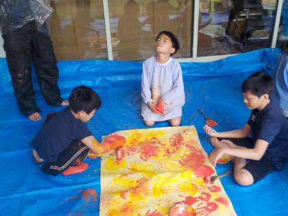 11月に行われるフェスティバルに向けて、絵の具で模造紙に色を塗りました。