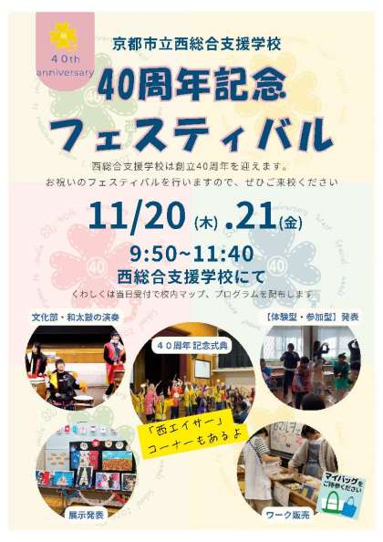 11月20日(木)21日(金)の9:50より、創立40周年を迎える西総合支援学校にて、40周年記念フェスティバルが開催されます。保護者の皆様、地域の皆様、ぜひご来校ください。