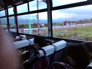 貸し切り臨時バスに乗り、琵琶湖博物館へ向かっています。