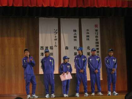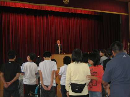 始業式後の全校集会では,10月13日(土)から岐阜県で行われる,全国障害者スポーツ大会「岐阜清流大会」に出場する6名の生徒の壮行会を行いました。「自己ベストをめざします」「日本一になります」「メダルととってきます」など,一人ひとりの熱い決意が語られました。
