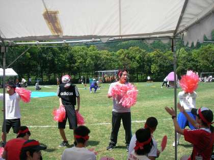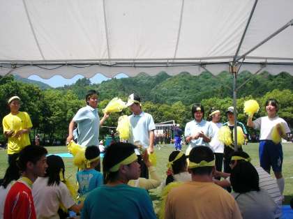 赤色,黄色,それぞれの応援リーダーが座席の前に出て,一生懸命,応援を盛り上げています。