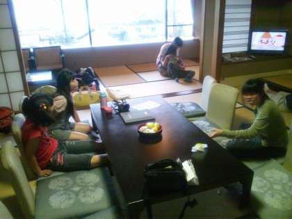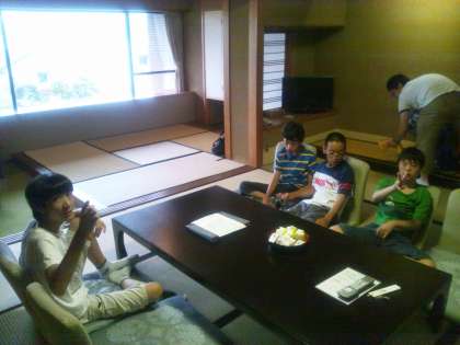 入館式をして、部屋に入って一息つきました。今日は、男子1部屋、女子2部屋に分かれて寝ます。