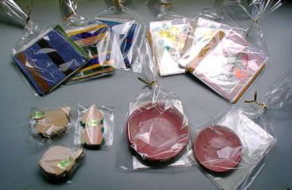 毎年,ワークスタディの製品をお礼としてお渡ししており,今年度も,さおり織コースター(布加工班),エコマグネット(木工班),小皿(陶工班),メッセージカード(紙工班)などを作ってもらいました。袋詰めしたプレゼントを高等部の生徒が職員室に納品してくれました。