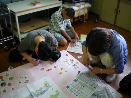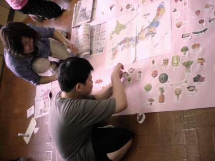 玉葱のシールを見ながら,「玉葱 大阪」等,食物のシールを手にとって,都道府県名を答えながら貼っています。