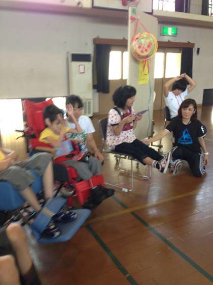 沓掛寮の方から,水戸黄門の曲に合わせた楽しい体操を教えていただきました。西総合の生徒もノリノリです。