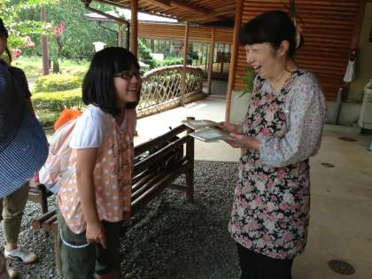 よろしくお願いしますと挨拶!そして,以前いただいたブラックベリーで染色班が染めたタオルを渡しました。満面の笑みで喜んでくださいました。