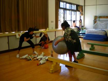 読み聞かせのテレビ放送で,今回もクイズをしました。正解者はマントを付けてピーマンマンになりボウリングで「のどいたバイキン」や「はらいたバイキン」のピンを倒しました。効果音に一喜一憂したり,バイキンを倒して喜んだり・・・。積極的に前まで来てやっつけた人もいました。