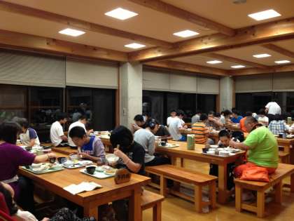 晴天の下,いっぱい体を動かし,お風呂もすんで夕食タイムです。さすがに,みなさんお腹が減っているのか,よく食べています。特に,メインディッシュのメンチカツを「美味しい…」と喜んで食べています。