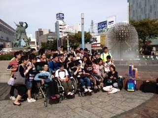 岡山駅の桃太郎像の前で記念撮影。