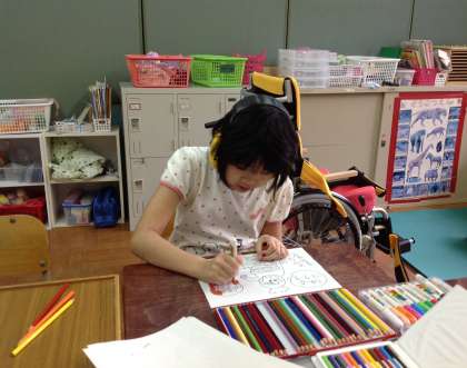 小学部に絵を描くのが好きな児童がいます。彼女が描いたストーリーのある絵をiPadで絵本のようにして持っていくと、喜んで見ていました。