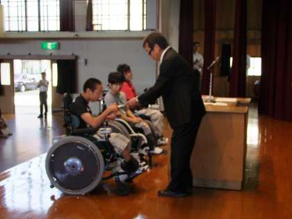 終業式後,漢字検定の表彰式と,先月行われました全京都総合陸上競技大会でスラロームに出場した3名の生徒が代表で表彰されました。