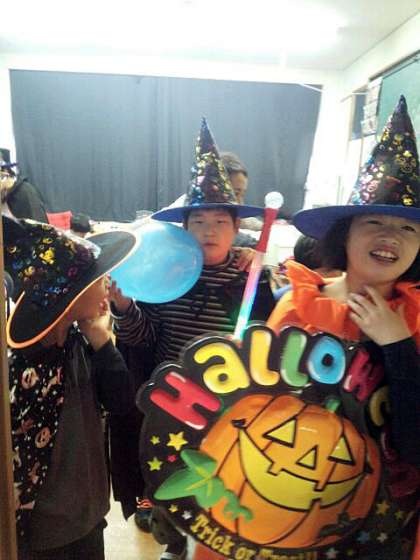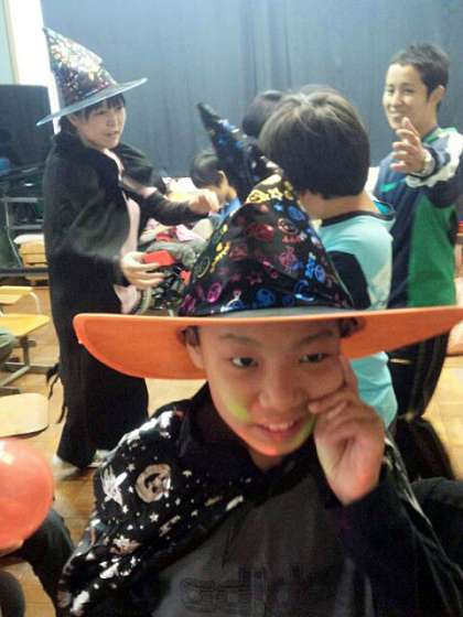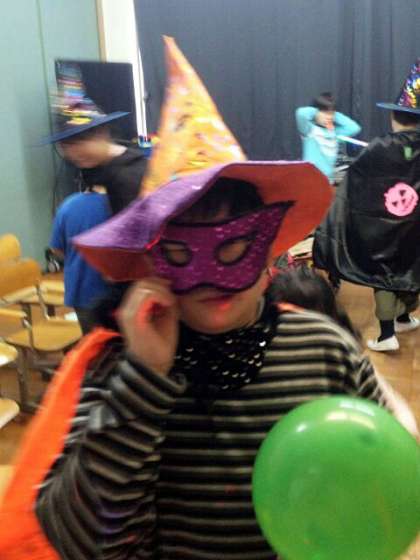 仮装をして校内をパレードし,教室で部屋を真っ暗にして光遊び等,大盛り上がりです。パレードに間に合わず,パレードの写真は撮影できませんでしたが,カメラを向けると,お気に入りの仮装をしてピースをしてくれました。