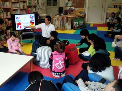 「私の出身の国はアメリカです。アメリカはどこにあるかわかりますか?」と,セオ先生が大型TVに映っている世界地図を示すと,「はい!」と大きな声で手を挙げて,TVを指さしていました。