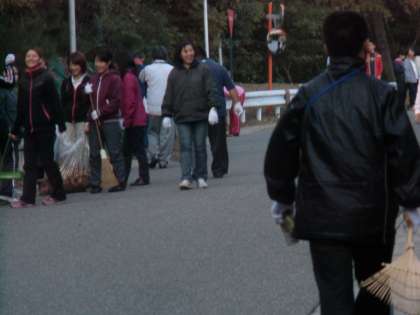 たくさんの教職員で,たくさんのごみや落ち葉を集めました。