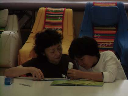 (下)  「音声読み上げペン サトシくん」をシールに当てながら,音読しています。