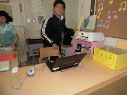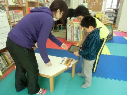 iPadで自分の好きな本の写真を撮り,「印刷」の文字をタップすると,離れた所にあるプリンターから印刷された紙が出てきます。子どもたちは,びっくり。その後,はさみで切って名前を書き,ラミネートをかけました。パンチで穴を開け,リボンを通してできあがり。