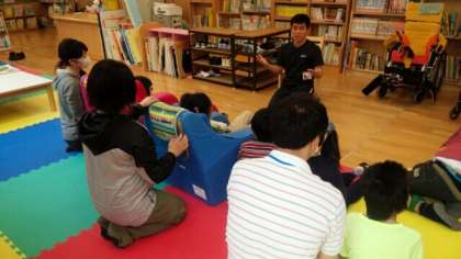 大型絵本で,「はらぺこあおむし」の読み聞かせを先生にしてもらい,「あおむしさんは何になるかな?」と聞かれると,数名の子どもが大きな声で「ちょうちょ!」と答えていました。