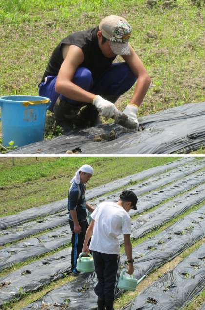 5月29日(木)・30日(金),楽洛農園(らくらくのうえん)で,サツマイモ・サトイモの植え付けと,刈り草を集め堆肥槽に運ぶ活動をしました。大変暑い中でしたが,生徒たちは黙々と作業をしていました。