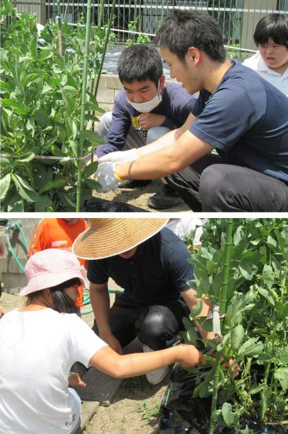 6月3日(火),中学部ワークスタディ 園芸班が,朝霧農園(屋上の農園)で,スナップエンドウとソラマメを収穫しました。