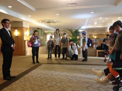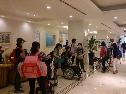 エントランスでホテルの方にあいさつをして,各部屋に入り,休憩・荷物の整理をしています。