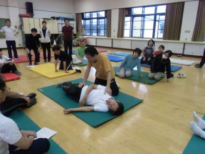 講義を聴いた後,ペアになって実技研修を行いました。