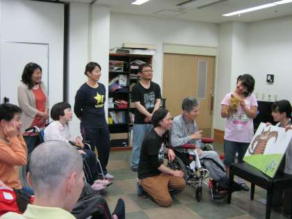 大型絵本「にゃーご」の読みきかせでは,桂川療護園の利用者さんの読み聞かせに合わせて,本校の生徒が,人形を手に「にゃーご。」とセリフを繰り返していました。部屋全体が楽しい雰囲気に包まれ,笑顔があふれていました。