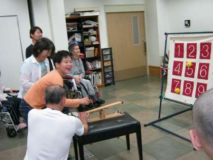 的当てゲームでは,本校から持参した投てき機が大人気。一人3回ボールを投げて,得点を競いましたが,もっと投げたい!という人がたくさんいました。